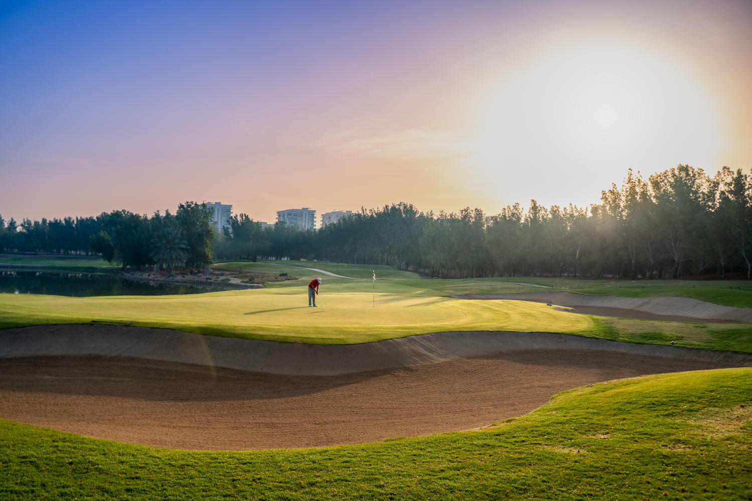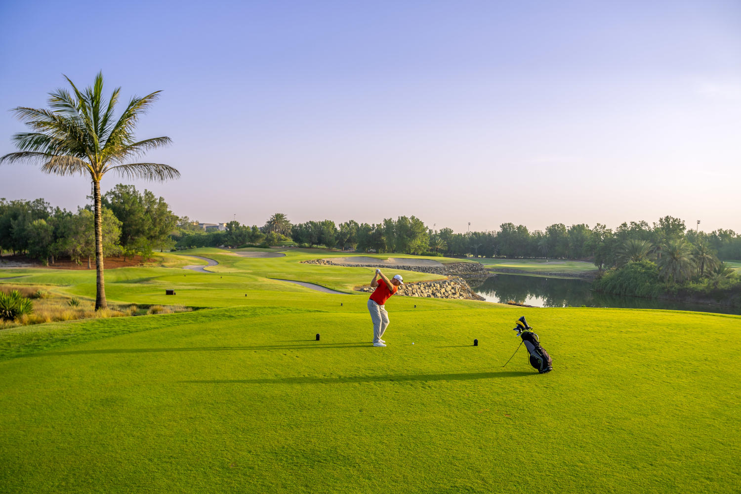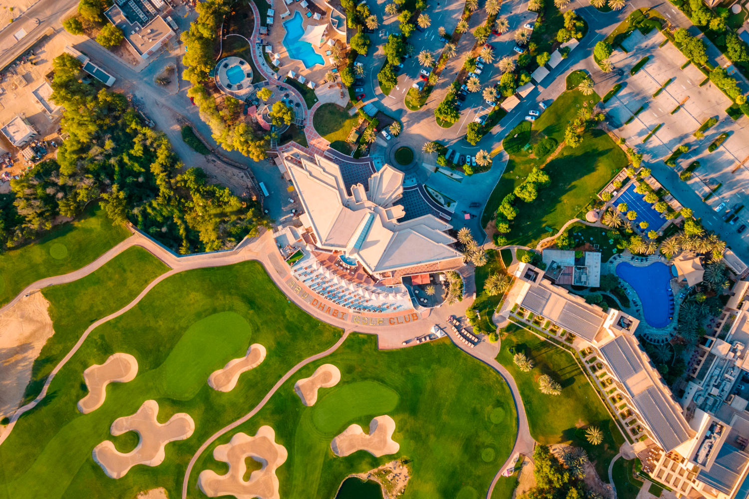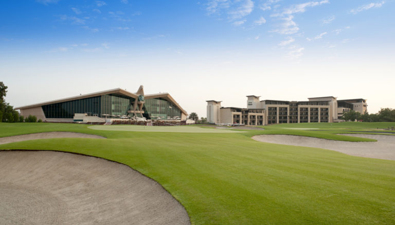 Abu Dhabi Golf – Der Abu Dhabi Golf Club ist wohl der luxuriöseste Golfclub im Nahen Osten. In Form eines Falken mit ausgebreiteten Schwingen erkennt man das Clubhaus bereits vom anderen Ende des Platzes über die Seen hinweg.