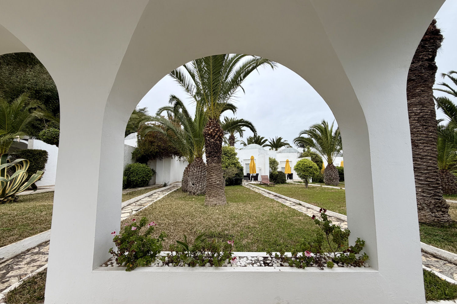 In Hammamet habe ich mich für das 5-Sterne-Hotel „The Sindbad“ entschieden, das sich abseits der Sommerferienmonate (wo es mit Badetouristen ausgelastet ist) auf Golfreisende spezialisiert hat. Das Hotel hat 145 Zimmer und 9 Suiten (die Suiten sind direkt am Meer), die in den nächsten drei Jahren alle komplett renoviert werden. Die Anlage ist großzügig angelegt: Es gibt viele Grünflächen, die meisten Zimmer verfügen über eine Terrasse samt Garten, man geht durch überdachte weißgestrichene Arkadengänge von einem Bereich zum nächsten. Alle Zimmer sind überdurchschnittlich groß (meist über 30m²) und verfügen neben einem Doppelbett auch über eine Couch oder ähnliche Sitz- und Entspannungsmöglichkeit. Dazu kommen Wanne und eine separate Dusche im Badezimmer.